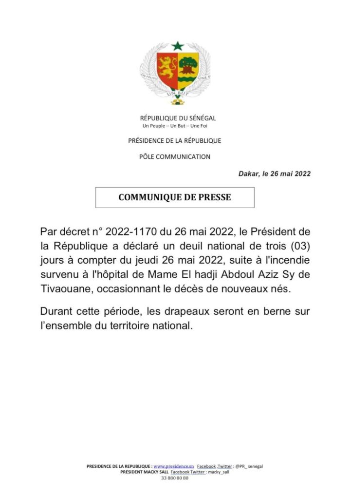 Communiqué de presse de la Présidence de la République du Sénégal.
